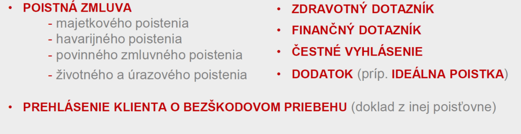 Nižšie sa nachádza zoznam dokumentov, pri ktorých je nevyhnutné odovzdať do poisťovne i originál papierového dokumentu (pokiaľ sa nejedná o dojednanie poistenia/zmeny na diaľku alebo digitálnou formou).