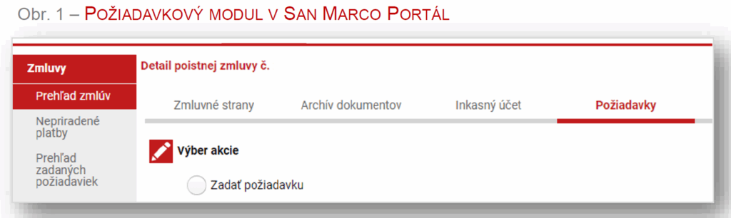 - Žiadosti spisujte s klientom prednostne prostredníctvom San Marco Portal (viď obr. 1) a primárne s možnosťou digitálneho podpisu Pokiaľ realizáciu digitálneho podpisu neumožňuje akákoľvek technická prekážka či už na strane klienta alebo na vašej strane, v rámci vytvárania žiadosti môžete vybrať spôsob podpisu manuálne, čo si však už vyžaduje tlač dokumentu ako aj opatrenie podpismi na vytlačenom formulári.